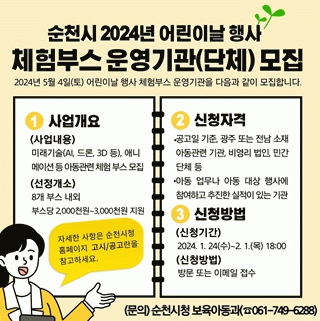 시 관계자는“순천의 미래인 어린이에게 현대사회에서 중요한 미래기술 등 다채로운 경험을 제공하여 어린이와 시민이 모두 만족하는 축제가 되도록 준비하고 있으니, 체험부스 운영자 모집에 시민들의 많은 관심과 참여를 바란다”고 말했다.