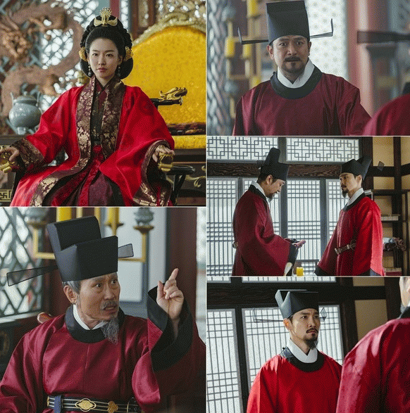 오늘(19일) 공개된 스틸에는 사경을 헤매는 현종을 대신해 정전에 든 원정이 김은부의 죄의 유무를 살피고 있다. 허리를 곧게 펴고 날카로운 눈빛으로 대신들을 바라보고 있는 그녀의 모습에서 반드시 김은부를 탄핵시키고 말겠다는 의지가 느껴진다.