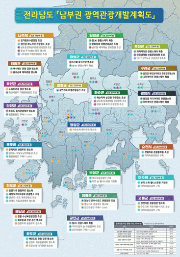 남부권 광역관광 개발사업은 글로벌 관광도시 전남으로 대도약하는 초대형 관광개발프로젝트 사업이다. 전남 22개 시군의 매력적인 특화관광자원을 기반으로 올해부터 2033년까지 10년간 56개 관광개발사업에 총 1조 3천20억 원의 예산이 집중 투입된다.