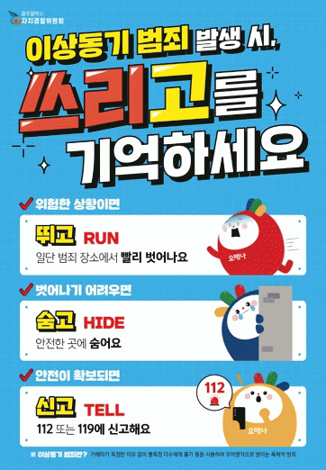 1단계는 범죄현장에서 최대한 빨리 벗어나기 위해 ‘뛰고’, 2단계는 주변의 안전한 곳에 ‘숨고’, 3단계는 안전이 확보되면 112나 119에 ‘신고’하는 대응책이 제시돼 있다.