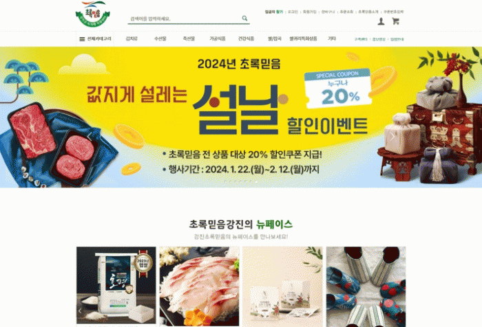 행사는 1월 22일부터 2월 12일까지로, 기존 초록믿음 회원 누구에게나 20% 할인쿠폰이, 신규 가입 고객에게는 즉시 사용 가능한 5,000원 e머니가 제공된다.