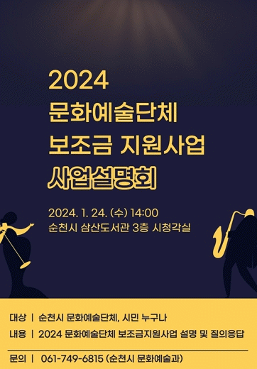 시 관계자는 “예술인들의 복지를 증진하고 문화예술을 향유하는 순천이 되기 위해 노력하고 있다”며 “이번 사업설명회는 바뀌는 시스템에 대한 안내가 있으니 많은 시민들과 보조금 신청 예정인 예술단체에서는 꼭 참석해 주기를 바란다”고 전했다.