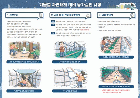 비닐하우스 등 폭설 피해가 우려되는 시설은 보강 지주를 2~6m간격으로 설치하고, 하우스 끈을 팽팽하게 당겨 바람에 날리지 않도록 고정해야 한다. 눈이 오는 날은 수시로 하우스 눈을 쓸어내리고, 가온시설이 있는 하우스는 커튼과 이중비닐을 열고 난방기를 가동시켜 쌓인 눈이 녹아내리도록 조치해야 한다.