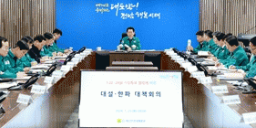 김영록 지사는 이날 대책회의에서 “재난대책본부 비상대응 체계 운영 및 비상근무 체계를 철저히 하고 유관기관 협조 체계도 잘 구축해 대설·한파 대책에 만전을 기해달라”고 당부했다.
