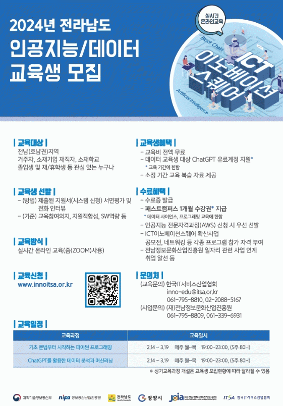 이용신 디지털정보과장은 “이번 교육은 실무 맞춤형 교육으로 진행돼 실무 역량을 높일 수 있는 좋은 기회가 될 것”이라며 “올해로 5년 차를 맞이하는 전남ICT이노베이션스퀘어 교육에 시민들의 많은 관심과 참여를 바란다”고 말했다.