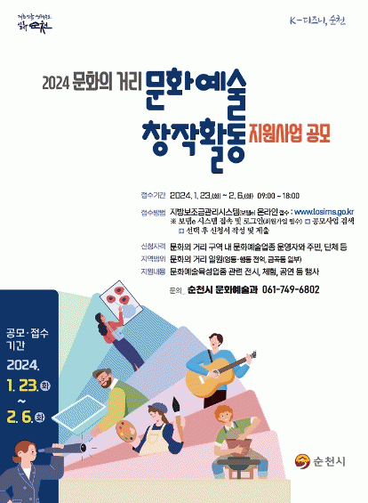 접수 기한은 1월 23일부터 2월 6일 18시까지이며, 자세한 내용과 필요서류는 순천시 홈페이지 공고 및 보탬e시스템을 통해서 확인하거나 순천시 문화예술과로 문의하면 된다.