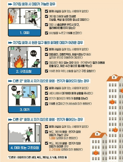 개선된 공동주택 화재 시 피난행동요령은 자기 집에서 화재 발생 시, 대피가 가능한 경우는 대피, 대피가 불가능한 경우 구조요청 및 피난시설 활용, 다른 곳에서 화재 발생 시, 화염·염기가 들어오지 않는 경우는 대기를 화염·연기가 들어오는 경우 구조요청 및 대피를 제시한다. (사진참조)