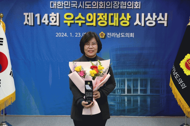 우수의정대상을 수상한 박경미 의원은 ‘전라남도교육청 협력수업 운영 지원 조례안’과 ‘전라남도교육청 학생 성조숙증 예방 및 관리 조례안’을 각각 전국 최초로 발의하여 학습결손 학생의 적기 해소 및 학습부진 예방 마련, 성조숙증으로부터 모든 아이들이 육체적, 정신적으로 건강한 발달로 희망찬 미래를 꿈꾸는 데 크게 기여한 공로를 인정받았다.