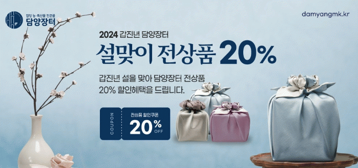 2024년 갑진년을 기념해 전 품목 20% 할인을 추진하며 담양장터몰에서 가공식품, 전통 주류, 한우, 딸기 등 다양한 상품을 할인가에 만나볼 수 있다.