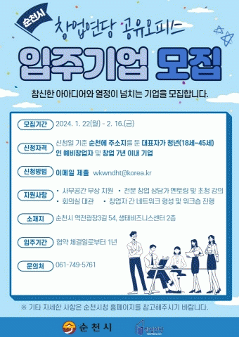 신청은 1월 22일부터 2월 16일까지이며 자세한 자격요건 및 신청 방법 등은 순천시청 홈페이지에서 확인할 수 있다.