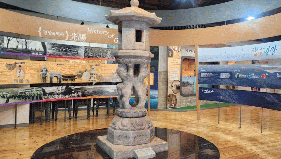 광양역사문화관을 들어서면 세련되고 역동적인 국보 ‘광양 중흥산성 쌍사자 석등’ 복제품이 방문객을 사로잡는다.