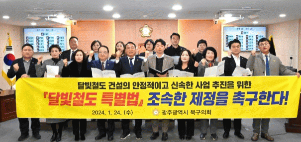 북구의회도 지난 24일 성명서를 발표하고 “달빛철도 건설은 영호남 주민들의 오랜 염원이자 윤석열 대통령 대선 공약으로, 여.야 협치의 상징법안이며 영호남 상생과 균형발전의 대표법안임에도 법제사법위원회 문턱도 못 넘고 있다”고 지적하고 “영호남 상생발전, 지방소멸 위기 극복, 수도권 과밀화 해소, 국토균형발전, 신성장동력 창출, 국가경쟁력 향상 등 대한민국의 미래를 위해 특별법을 조속히 제정할 것”을 촉구한 바 있다.