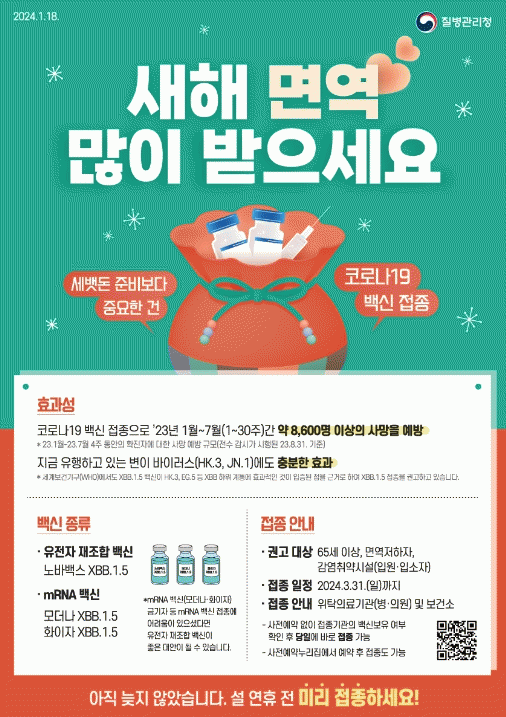 가족·친지와의 만남이 잦은 설 명절에는 코로나19 감염 위험 증가가 예상된다. 특히 65세 이상 고령층과 감염취약시설 구성원 중 코로나19 신규 백신(XBB.1.5 기반)을 접종하지 않았다면 감염 예방을 위해 접종이 필요하다.