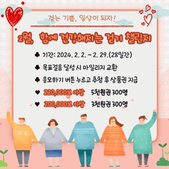 2월 2일부터 2월 29일까지 진행되는 걷기 챌린지는 1걸음 당 1마일리지 적립으로 1일 최대 8천 마일리지가 누적되며 목표 마일리지 달성 시 상품권 응모가 가능하다.