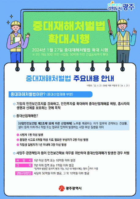 광주시는 27일부터 법 적용을 받게 된 소규모 사업자가 중대재해처벌법을 제대로 알지 못하고 있는 상황을 고려해 지난해부터 홍보활동을 펼쳐왔다.