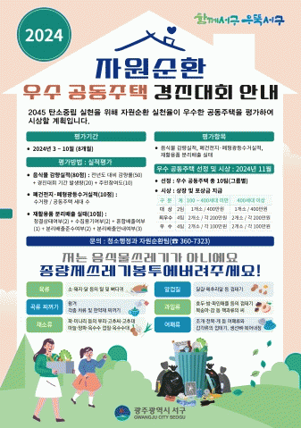 서구는 올해 3월부터 10월까지 음식물 감량실적(80점), 폐형광등.폐건전지 수거실적(10점), 재활용품 분리배출 실태(10점) 총 3개 분야의 자원순환 실천율을 평가해, 오는 11월 우수 공동주택 총 10팀(대상 2, 최우수 4, 우수 4)에게 상장 및 2000만원의 포상금을 차등 지급할 계획이다.