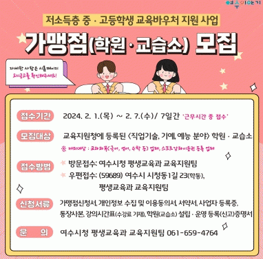 이 밖에 자세한 사항은 여수시 누리집 공고문을 확인하거나 시 평생교육과로 문의하면 된다.