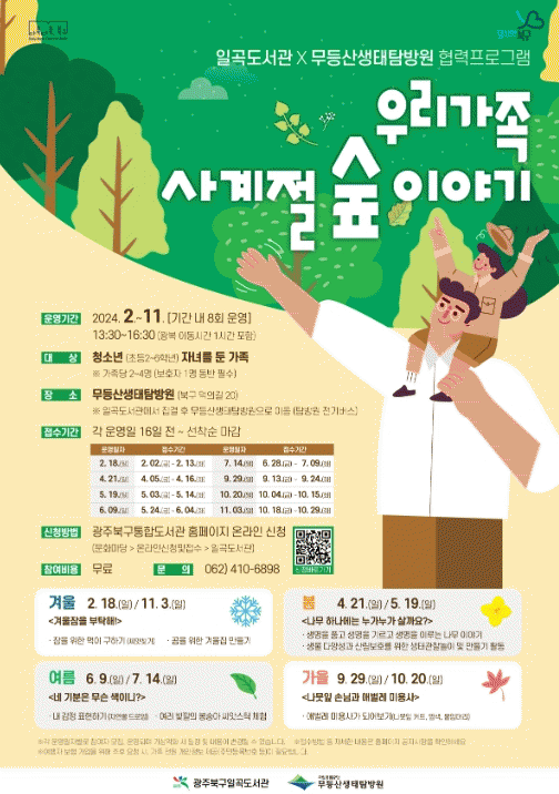 우리 가족 사계절 숲 이야기 프로그램은 무등산 문화.자연 체험 전문기관인 무등산생태탐방원 협력사업의 일환으로 초등학생에게 가족과 함께 자연에서 독서를 체험하는 특별한 기회를 제공하여 지역 아동들의 건전한 성장을 도모하고자 마련된 북구의 신규 시책이다.