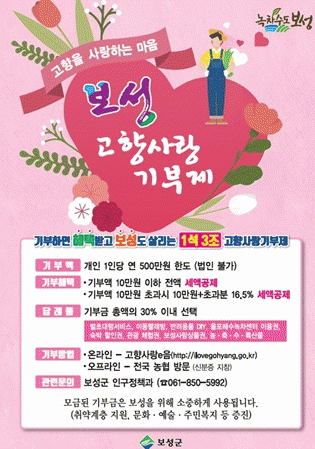 한편, 고향사랑기부제는 개인이 관할 주소지를 제외한 지방자치단체에 고향사랑e음과 농협 영업점을 통해 일정 금액을 기부하면 세액공제와 답례품(기부액 기준 최대 30%) 혜택을 주는 제도며, 최대 500만 원까지 기부할 수 있다.