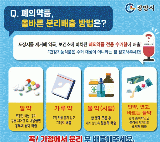 폐의약품은 폐기물관리법상 생활폐기물이지만 인체 및 환경에 유해한 영향을 줄 수 있어 유해폐기물로 분류해 반드시 정해진 장소에 분리배출해야 한다.