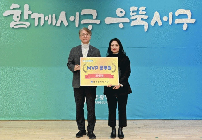 김이강 서구청장은 1일 MVP 시상식에서 “홍 팀장은 복지사각지대 발굴과 사회취약계층의 복지 증진에 사명감을 갖고 일하고 있다”며 “단 한사람도 소외되지 않는 사회돌봄망 시스템 구축에 우리 모두가 힘과 지혜를 모아나가자”고 말했다.