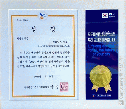 ‘대한민국 평생학습도시 좋은 정책상’은 전국의 우수한 평생교육 프로그램의 발굴과 보급을 위해 수여되는 상으로, 여수시는 지난해 ‘여수시민학교’에 이어 2년 연속 수상하는 쾌거를 이뤘다.