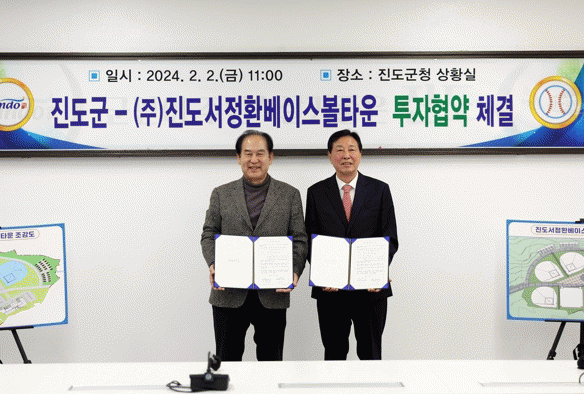 전남 진도군과 진도 서정환 베이스볼 타운은 지난 2일 진도군청 2층 상황실에서 프로와 아마추어 야구팀의 동·하계 전지훈련과 전국 대회 개최 등을 위한 야구장 조성을 위한 업무협약(MOU)을 체결했다.
