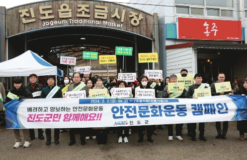 이번 안전문화운동은 설 명절을 맞아 생활 속 안전사고 예방 홍보를 위해 진도읍 조금시장에서 진도군청 직원들과 상인, 주민 등 50여 명이 참여했다.