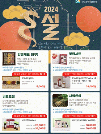민족 최대명절인 설날선물로 모든 생산품은 2월 8일까지 10세트 구매시 1개를 더 드리는 행사로 진행하고 있다.