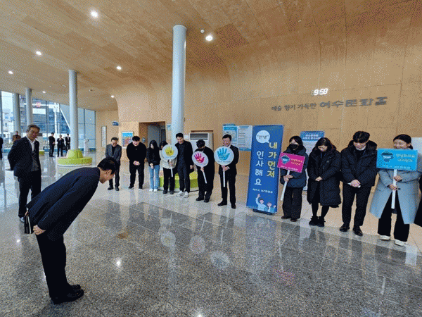 정기명 여수시장은 “직장동료들에게 먼저 인사하는 조직문화는 밝은 직장분위기 조성뿐 아니라 인권이 보장되는 직장문화 형성, 더 나아가 시민들에게 친절한 공직자상을 만들어 나가는 데 큰 기여를 할 것으로 기대된다”며 “시장인 나부터 적극 동참하겠다”고 밝혔다.