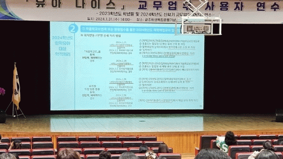 연수는 2023학년도 학년말 교무학사 업무처리, 2024학년도 신학기 교무업무 운영을 위한 기본 설정 정보, 2024학년도 입학 유아 대상 학적처리, 2024학년도 유아별 출결 처리 등으로 구성됐다.