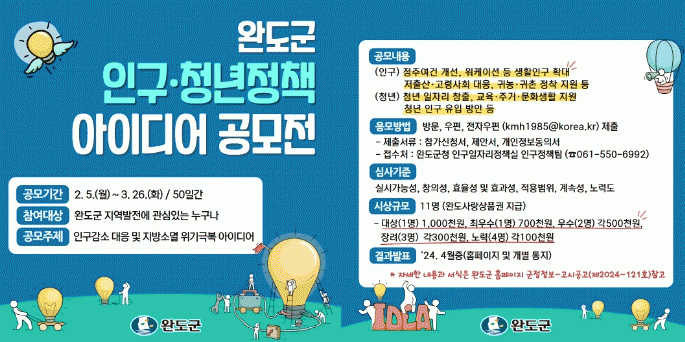 아이디어 공모전은 군민뿐만 아니라 완도 발전에 관심 있는 사람 누구나 참여할 수 있다.