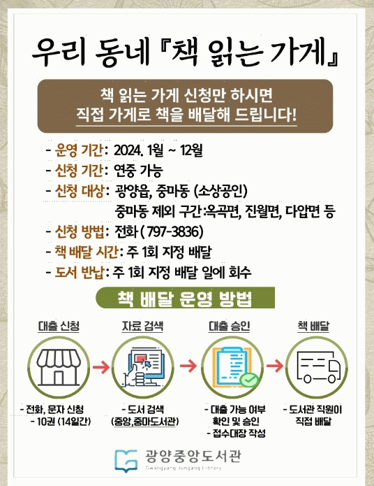 지난해에는 광양읍과 중마동 지역의 25개 가게에 총 3,460권의 책을 배달했으며, 주로 시민들이 장시간 머무는 미용실이나 카페 등에서 호응이 높았다.