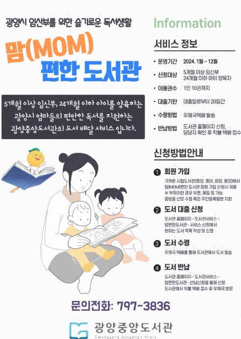 김미라 도서관과장은 “임산부와 육아에 힘든 엄마들이 가정에서도 편하게 책을 가까이 할 수 있도록 앞으로도 다양한 독서 장려 시책을 추진해 생애주기별 맞춤형 도서관 서비스 제공에 힘쓰겠다”고 말했다.