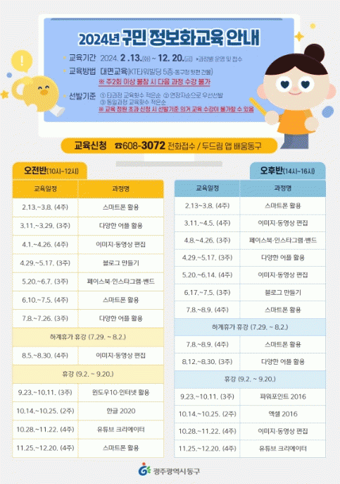한편 동구는 지난해 ‘2023년 구민 정보화 교실’을 운영해 코로나19 이후 일상 회복이라는 과도기를 지나 전면 집합 교육을 안전하게 추진하며 주민 800여 명이 교육을 수료하는 등 뜨거운 호응을 얻었다.