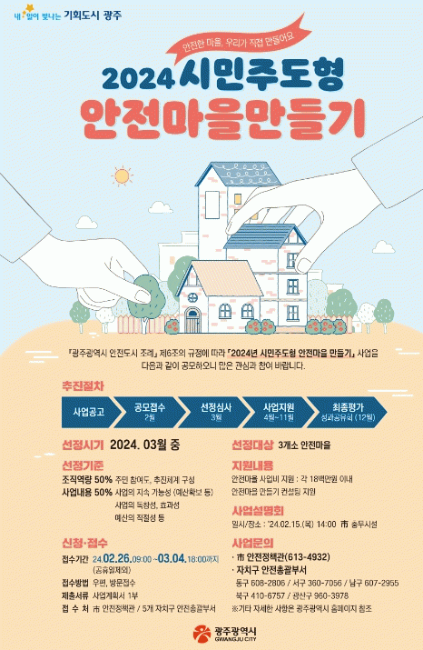 박남주 시민안전실장은 “안전한 지역공동체를 만드는 데 있어 시민의 자발적 참여가 절대적”이라면서 “안전마을 만들기 사업이 시민 주도의 안전한 광주공동체를 견인할 것으로 기대되는 만큼 시민들의 많은 관심과 참여를 바란다”고 말했다.