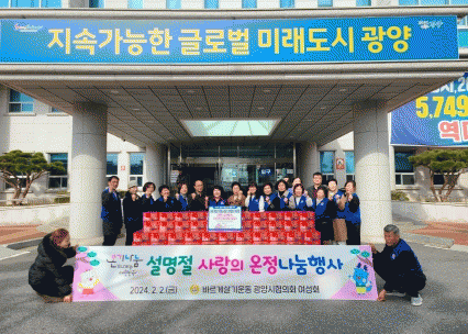 정용균 광양읍장은 “광양시 발전을 위해 적극적인 활동과 기부문화에 동행해 주신 바르게살기운동 광양시협의회 여성회에 감사드린다”며 “앞으로도 광양시 바르게살기운동과 함께 광양읍의 소외계층분들이 지역사회와 잘 소통할 수 있도록 사회적 취약계층 보호를 위해 최선을 다하겠다”고 말했다.