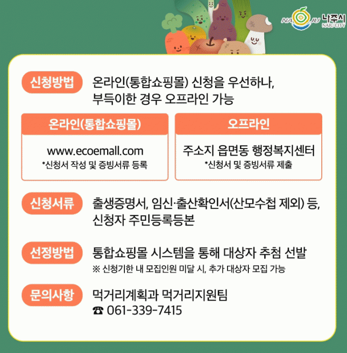 지원을 희망하는 대상자들은 내달 25일까지 인터넷 ‘임산부 친환경농산물 쇼핑몰이나 주소지 읍·면·동 행정복지센터에서 신청하면 된다.