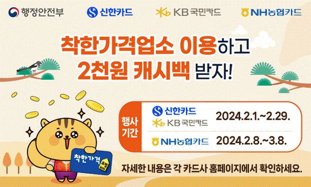 물가안정과 착한가격업소 활성화를 위해 추진되는 이번 행사는 ▲신한·KB국민카드는 2월 1일부터 29일까지 ▲NH농협카드는 2월 8일부터 3월 8일까지 진행된다.