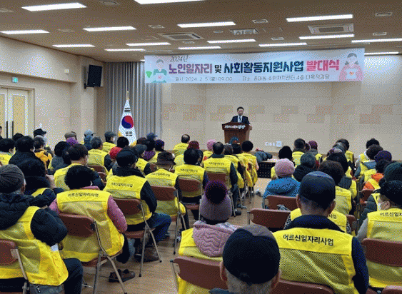 이날 발대식에는 노인일자리 및 사회활동지원사업 중마동 참여자 90명이 참석한 가운데 2024년 사업추진 방향을 설명하고 안전교육 등을 실시했다.