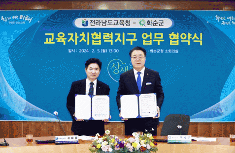 이날 협약식에서는 화순군수와 전남교육감 협약서 서명 및 교환식을 진행하고, 교육자치협력 사업의 그동안 추진 성과와 향후 추진 계획을 공유하면서 올해 5월 전남에서 열리는 2024년 대한민국 글로컬 미래 교육 박람회 개최에 대한 홍보도 함께 하기로 했다.