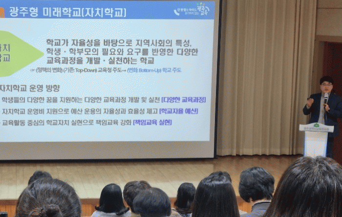 연수는 ▲광주형 미래학교 톺아보기 ▲새 학년 준비 운영 사례에서 길찾기 ▲새 학년 준비 연수 설계 및 계획 등 사례와 실습 중심의 연수로 구성됐다.