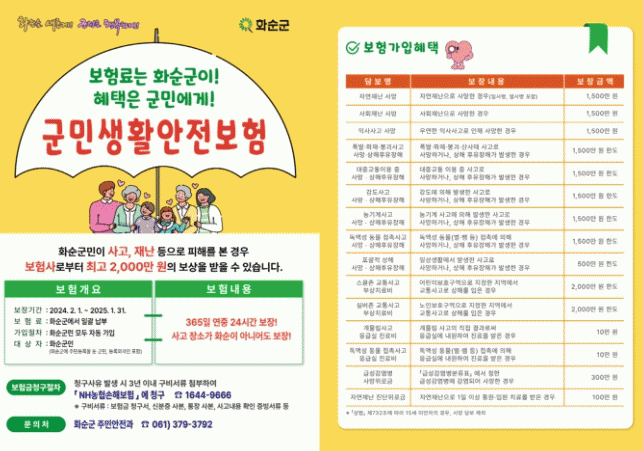 군민 생활안전 보험은 화순군에 주민등록이 된 군민(등록외국인 포함)은 누구나 혜택을 받을 수 있으며, 사고 발생 지역이 어디든 관계없이 타 보험에 가입하고 있어도 중복보장이 가능하다.