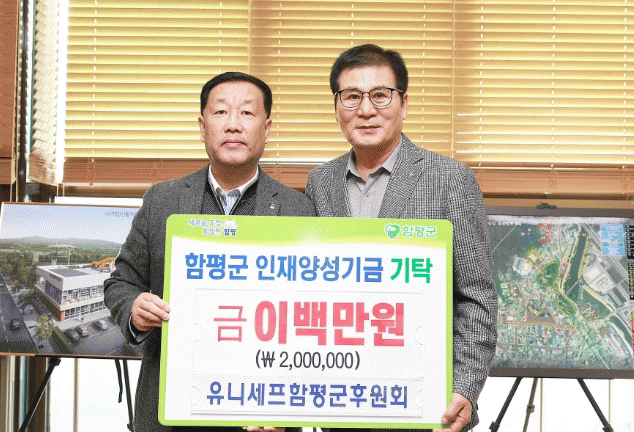 함평군은 “지난 2일 유니세프함평군후원회(회장 이재갑)에서 2백만원을 함평군 인재양성기금에 기탁했다”고 밝혔다.