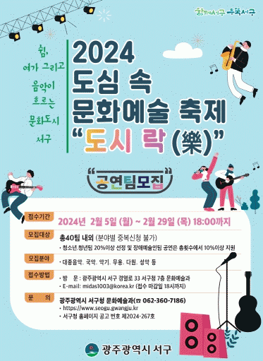 특히 서구는 도심속 문화예술축제‘도시 락(樂)’을 봄(감성 樂), 여름(열정 樂), 가을(낭만 樂), 찾아가는 음악회(함께 樂) 총 4가지 테마로 기획했다. 봄에는 벚꽃이 만개하는 광주천변에서 설레임이 있는 감성, 여름에는 청소년, 청년팀이 비보이, 힙합, 댄스 등 불타오르는 열정, 가을에는 억새축제장 및 공원에서 억새와 노을이 어우러진 낭만의 도심속 문화예술축제를 진행하며, 찾아가는 음악회는 7월~8월 중 직장인들의 신청을 받아 업무에 지친 직장인들에게 직접 찾아가서 공연을 선보이는 이벤트를 진행할 계획이다.