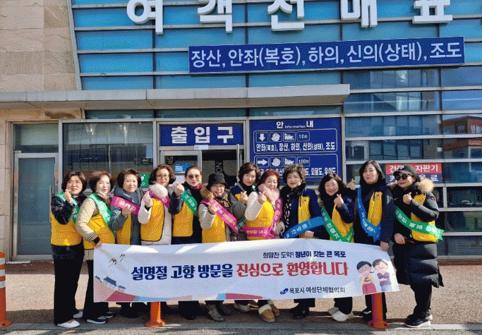 여성단체협의회는 회장단 및 회원 등 20여명이 참여해 설 명절을 맞아 고향 목포를 방문한 귀성객을 대상으로 환영인사와 함께 전남권 국립의과대학 유치 등 홍보 활동을 펼쳤다.