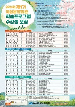 시 관계자는 “여성문화회관 학습프로그램은 다양한 교육과정을 통해 시민의 잠재능력 개발과 삶의 질 향상을 도모하기 위해 마련된 만큼 시민 여러분의 많은 참여를 바란다”고 전했다.
