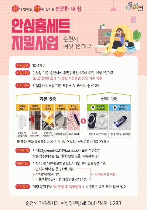 신청 자격은 순천시에 거주하는 65세 미만 여성 1인 가구이면 누구나 가능하며, 여성 범죄피해자, 장애인, 기초생활수급자, 차상위계층 등 우선순위 조건에 맞춰 선정하여 지원할 계획이다.