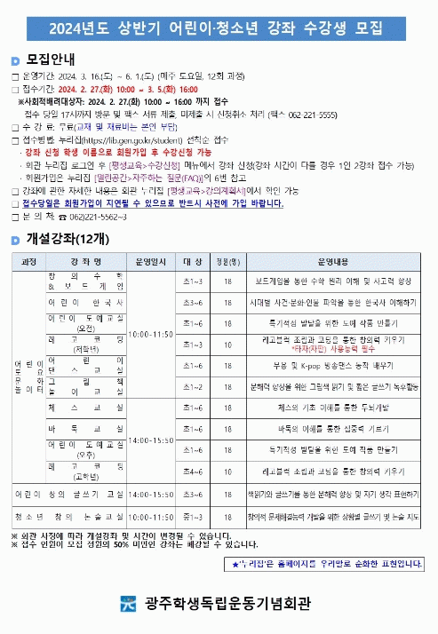 한편 강좌 신청은 광주학생독립운동기념회관 누리집을 통해 선착순 접수로 진행되며, 성인 문화강좌는 오는 2월 14일부터 2월 16일, 어린이·청소년 강좌는 2월 27일 부터 3월 5일까지이다.