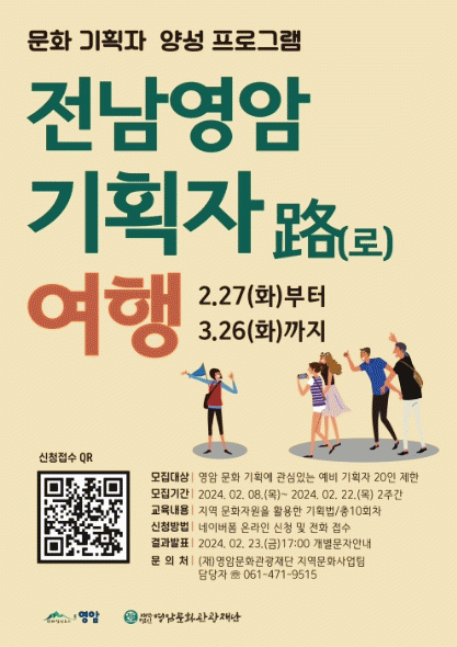 이번 교육과정은 영암 자원 발굴을 통한 ▲문화 기획자 사례 강연 ▲배움여행 ▲예비기획자 간의 네트워크 형성 ▲문화기획 프로젝트 시행 ▲그룹별 컨설팅 등 커리큘럼을 제공한다.